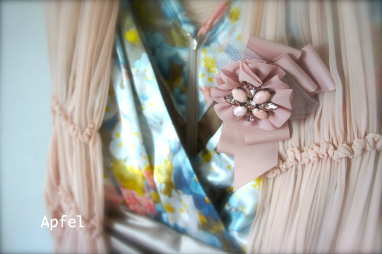 スカーフを留める花のクリップは銀座のお店で購入。