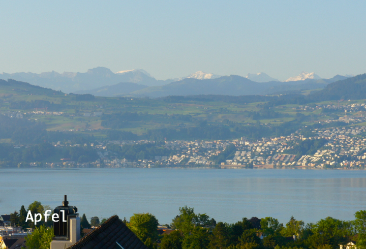 チューリッヒ郊外、湖畔の自宅から眺めたチューリッヒ湖とアルプスの山々・・。