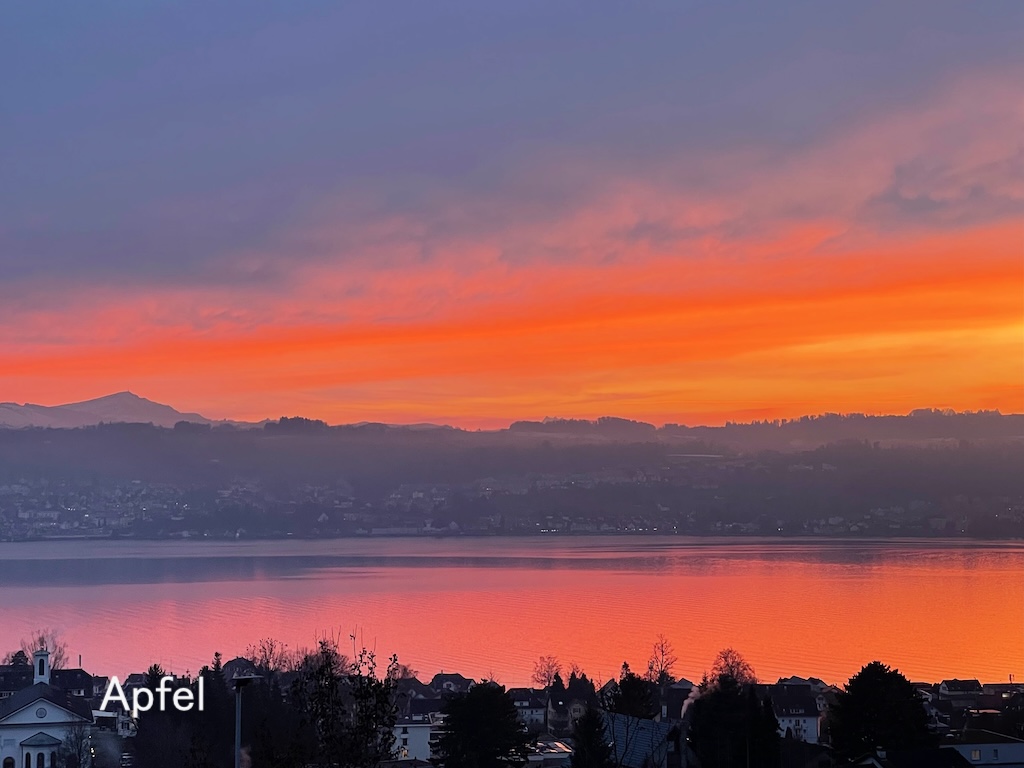 赤く染まるチューリッヒ湖と空が