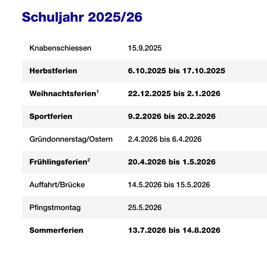 こちらはチューリッヒ市の学校の休暇表です。