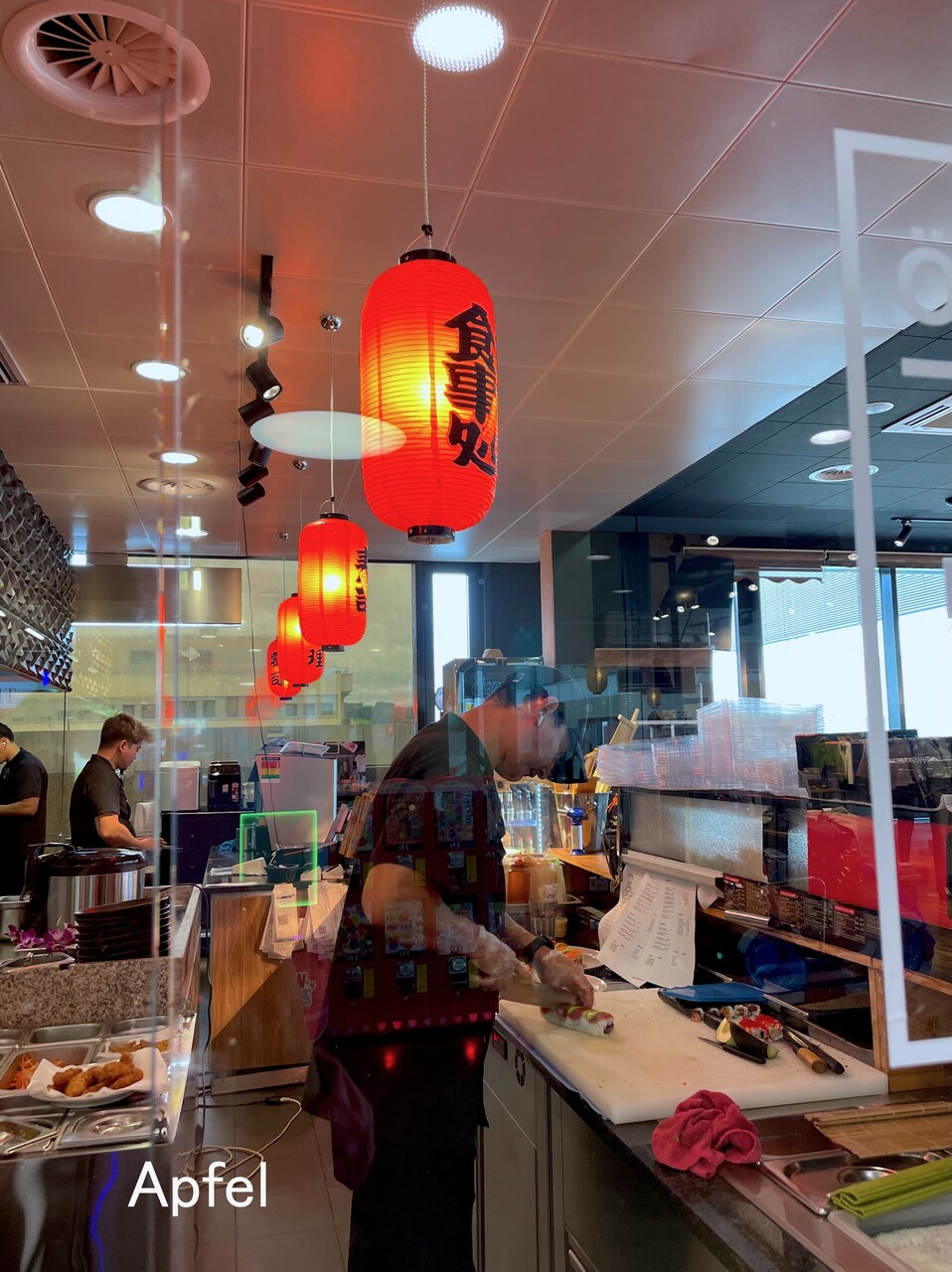 ガラス越しに外国人の料理人さんが、