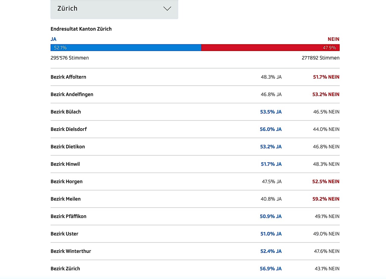 チューリッヒ州の地区ごとの結果。