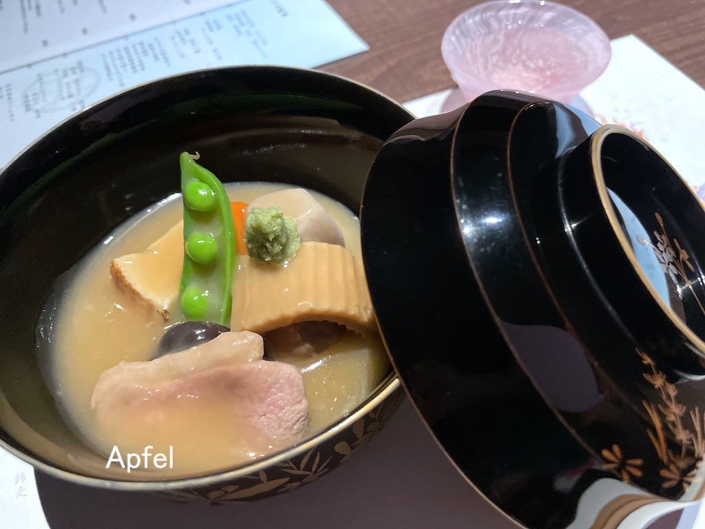 釜だきのご飯と魚介のお味噌汁、